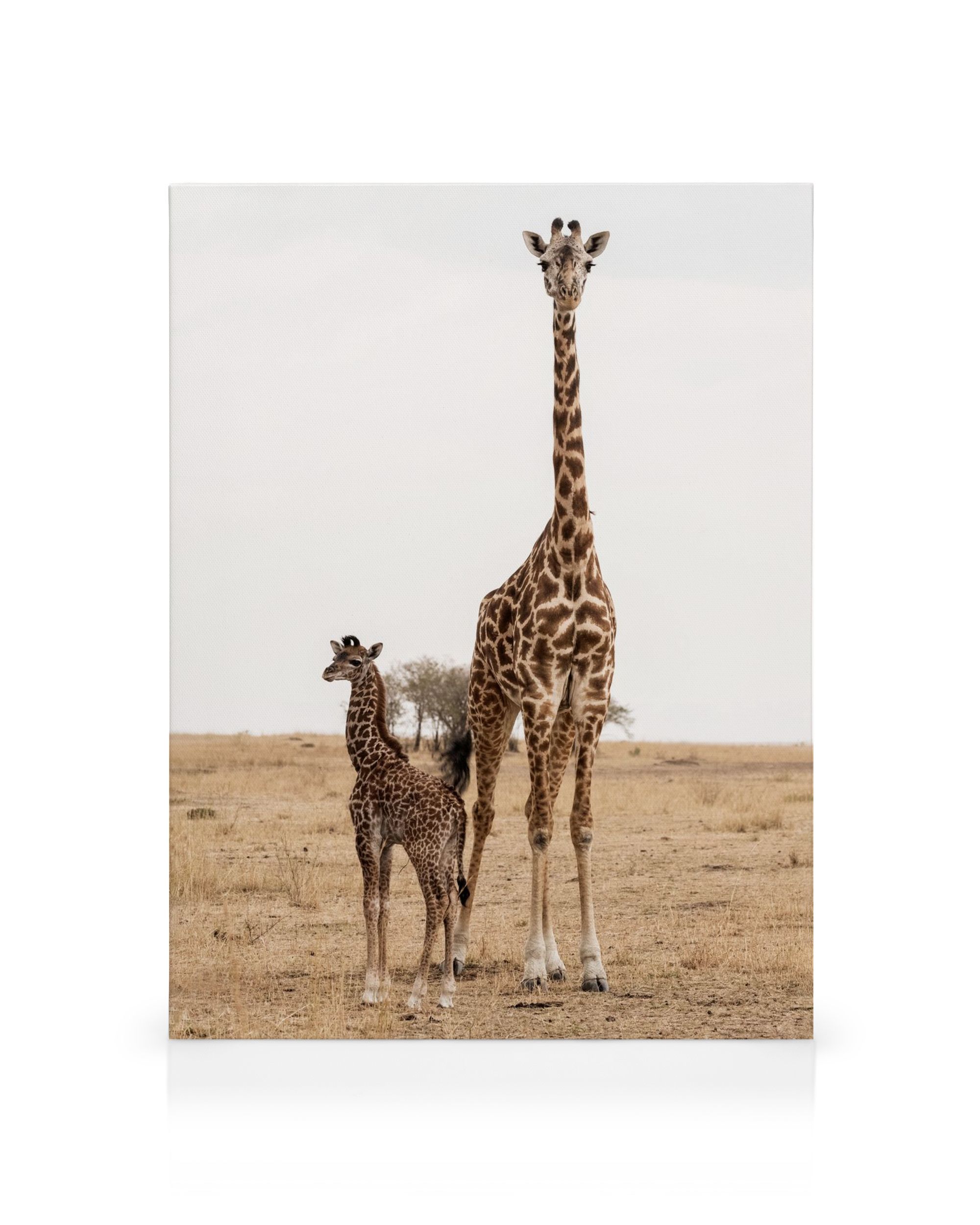 Kaksi kirahvia seisoo kuivalla ruohikolla. Iso kirahvi on pitkä ja sillä on ruskeat täplät. Pieni vauvakirahvi on emon vieressä. Taivas on vaalea ja pilvinen.