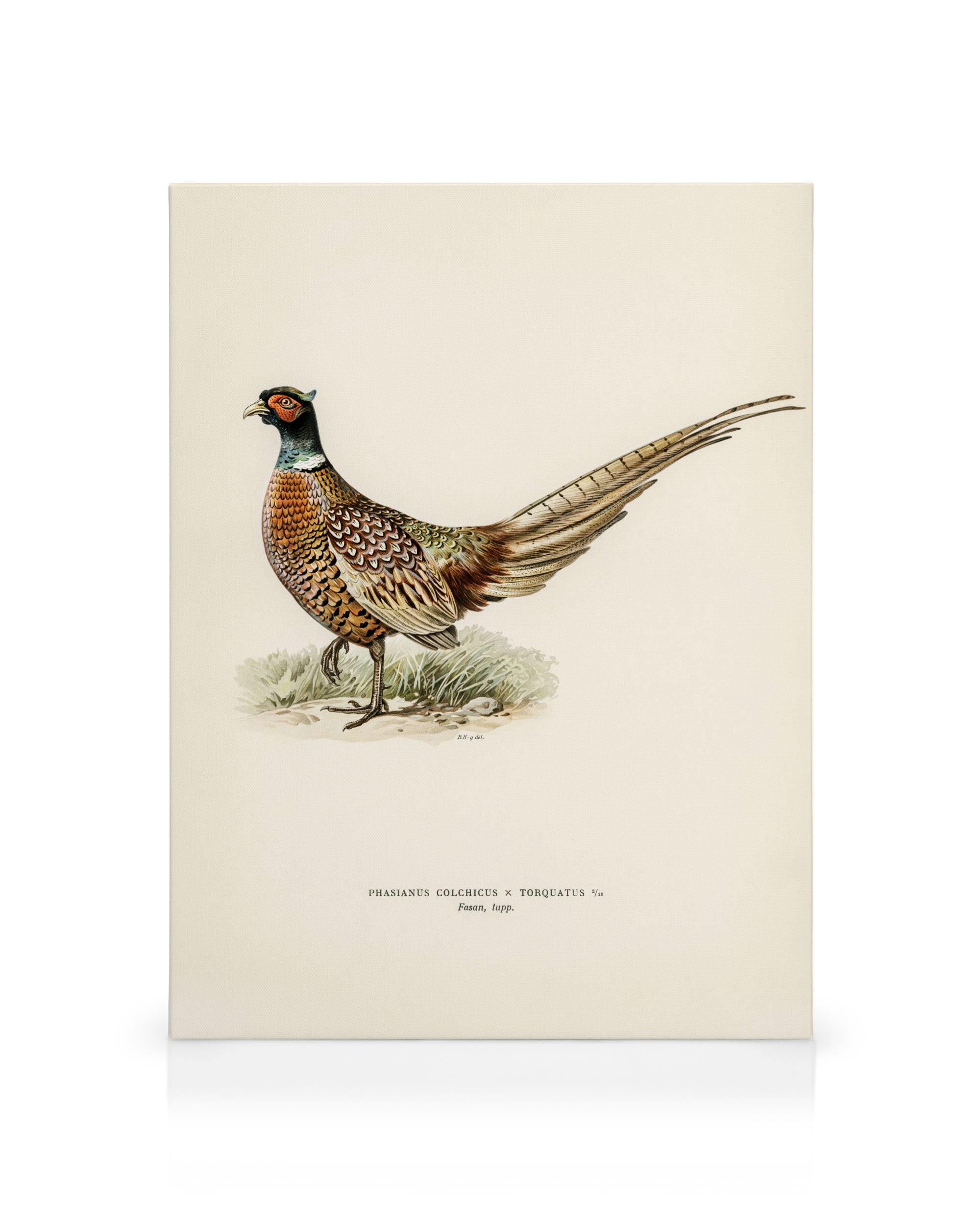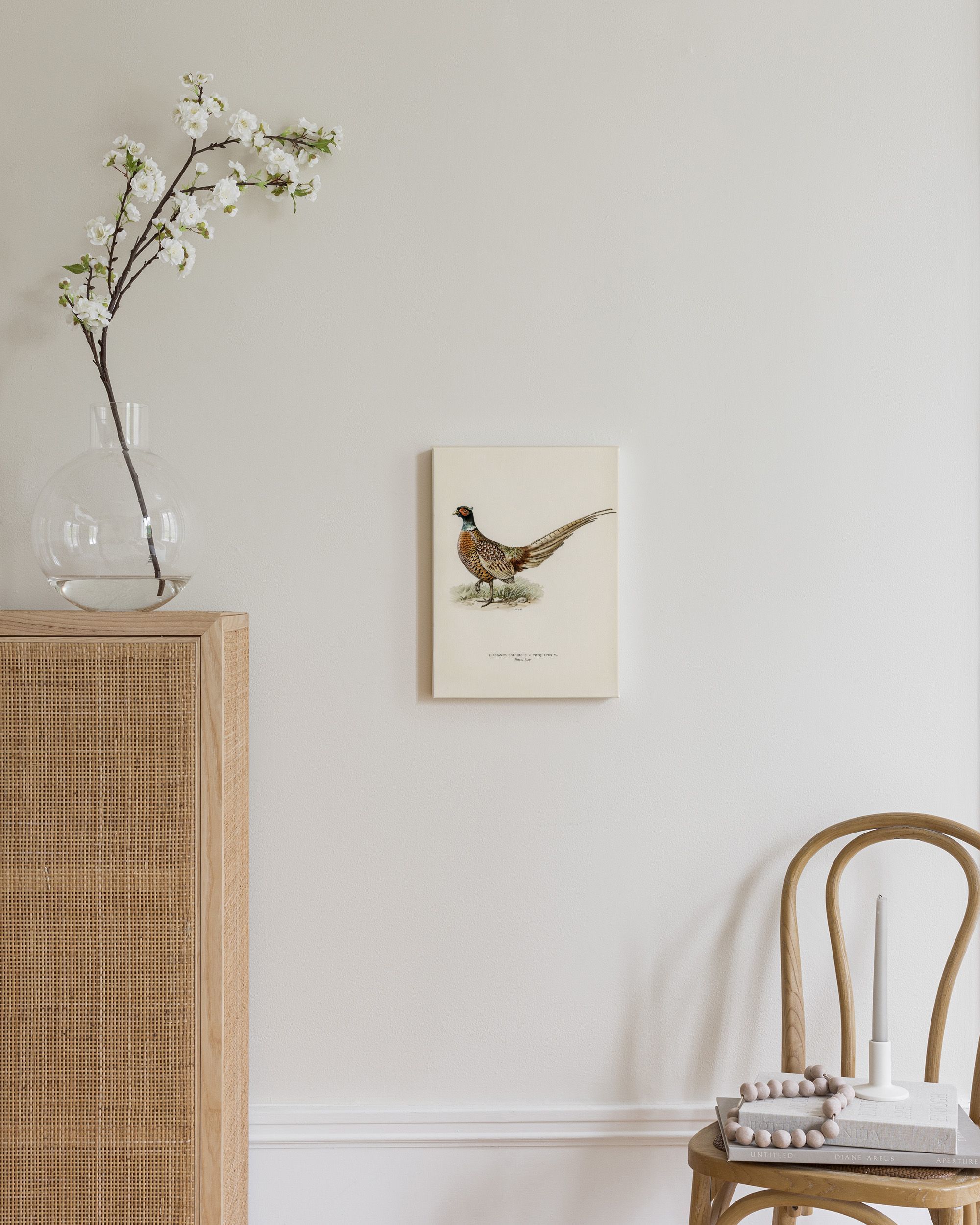 Alkaen 13,62 €Tämä kanvaasi esittelee kauniin fasaanin ruskeilla ja oransseilla höyhenillä. Linnulla on pitkä pyrstö ja kuvioitu vartalo. Pää on tumma ja kaulassa valkoinen rengas.