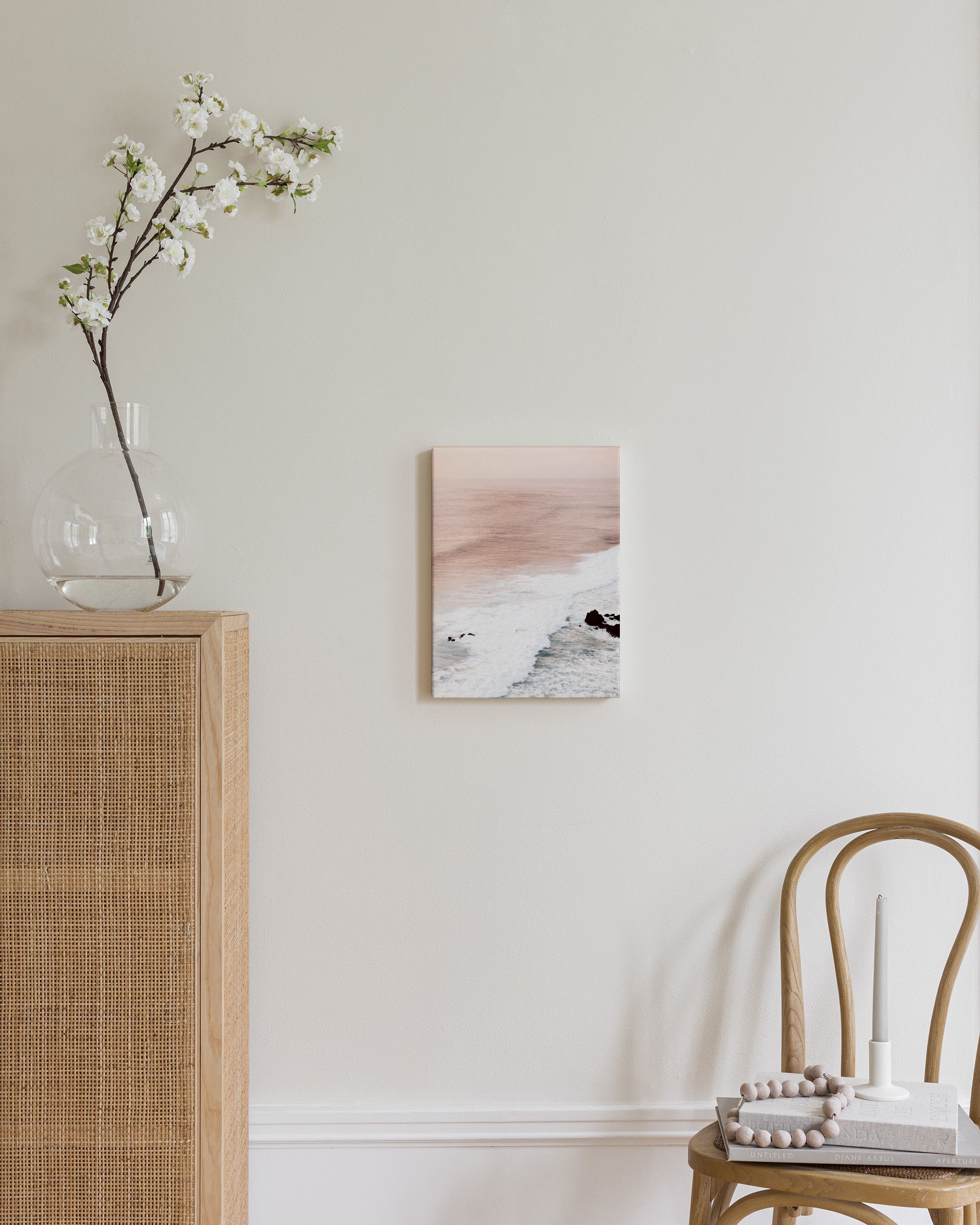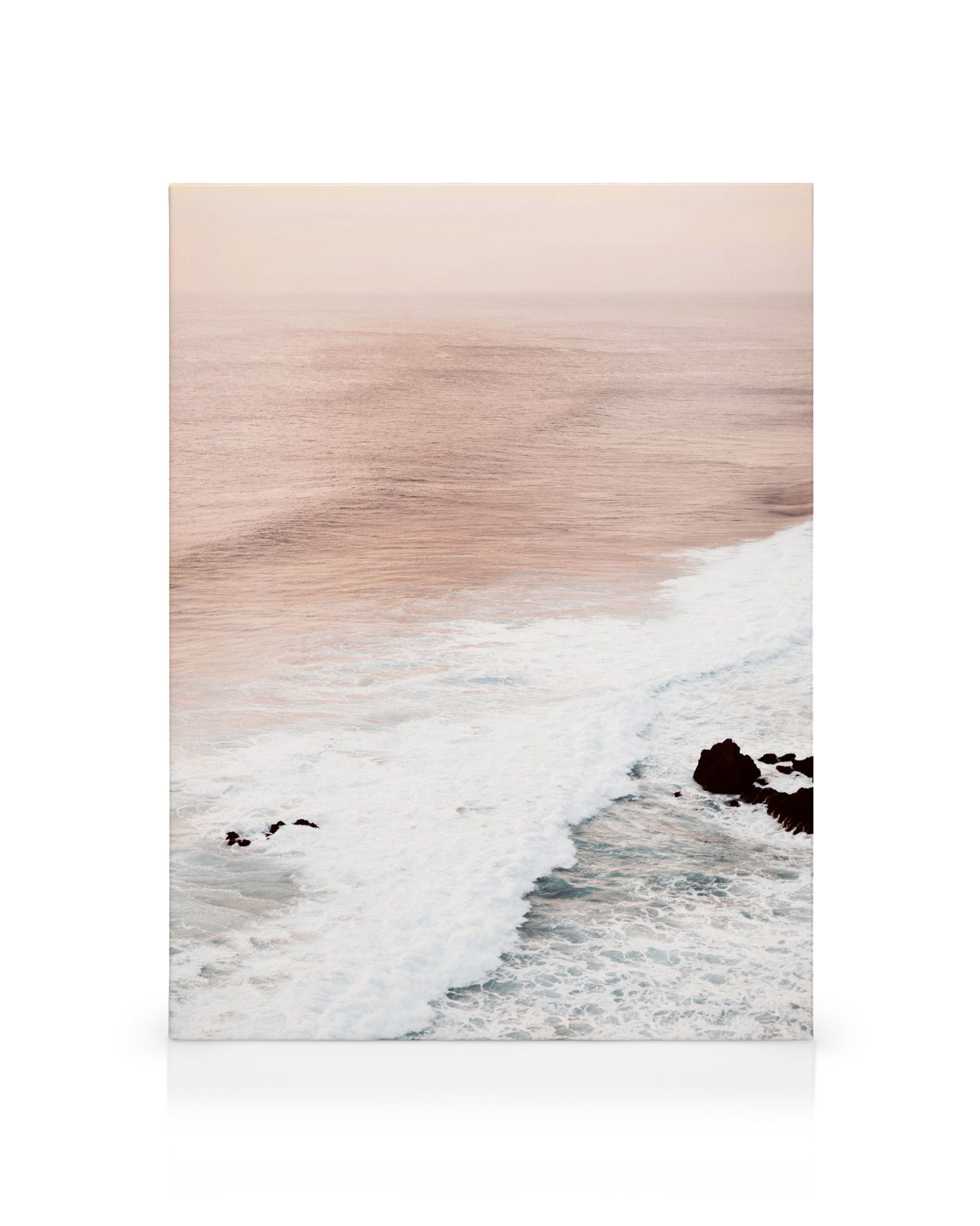 Tämä vaaleanpunainen juliste tuo rauhaa kotiisi. Pehmeät aallot ja tummat kivet luovat kauniin merinäkymän. Vesi kimaltaa vaaleanpunaisena ja valkoisena.