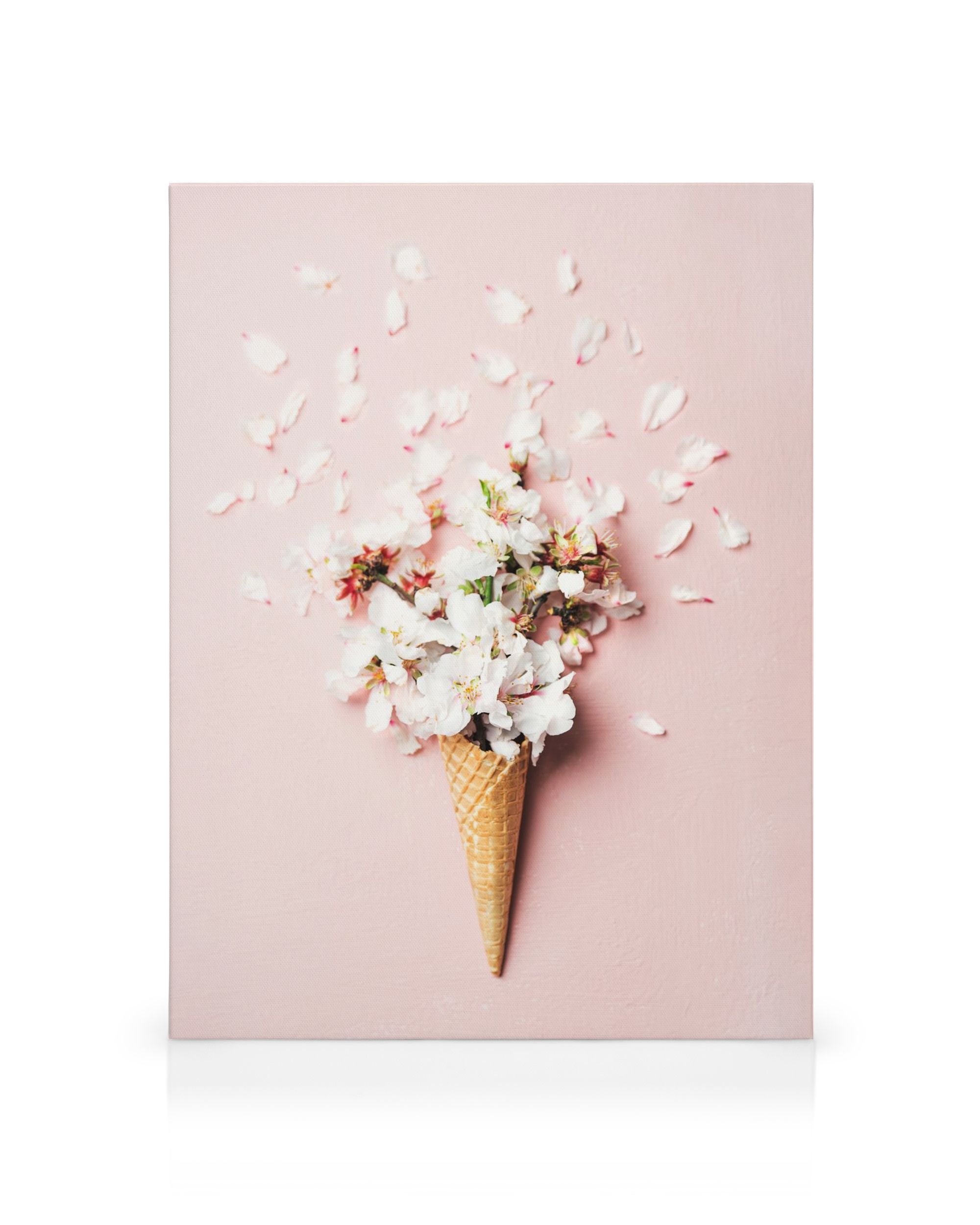 Pehmeä vaaleanpunainen juliste, jossa kukkia täytetty tuutti. Valkoisia kukkia ja terälehtiä putoilee kauniisti. Tämä taide tuo lempeyttä kotiin.