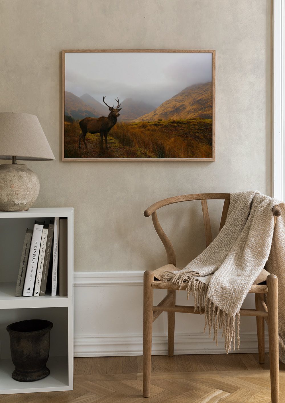 Juliste hirvesta, jolla on isot sarvet ja joka seisoo ruohikossa Skotlannin ylängöillä. Ruoho on keltaista ja ruskeaa, taustalla pilvisiä harmaita taivaita ja sumuisia vuoria.