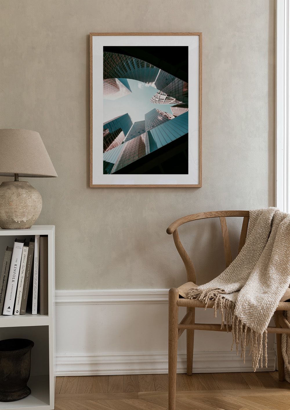Tämä juliste esittää pilvenpiirtäjiä alhaalta kuvattuna. Rakennukset muodostavat ympyrän ja niiden lasipinnat heijastavat sinistä ja vaaleanpunaista valoa. Taivas näkyy keskellä.