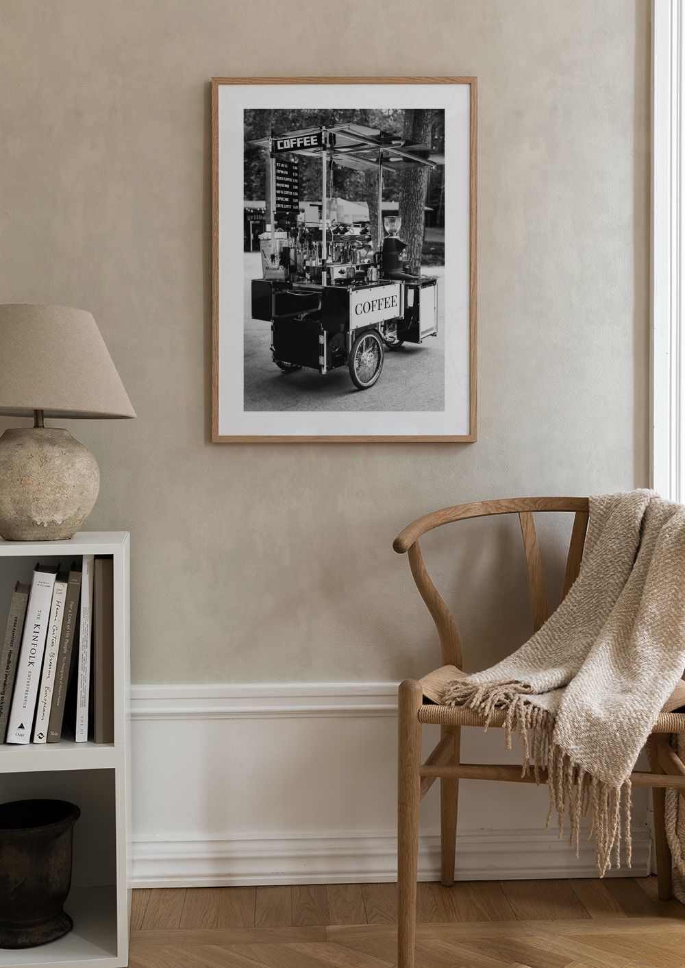 Mustavalkoinen juliste kahvipyörästä, jossa lukee "COFFEE". Tämä tyylikäs juliste tuo kahvilan tunnelman kotiisi.