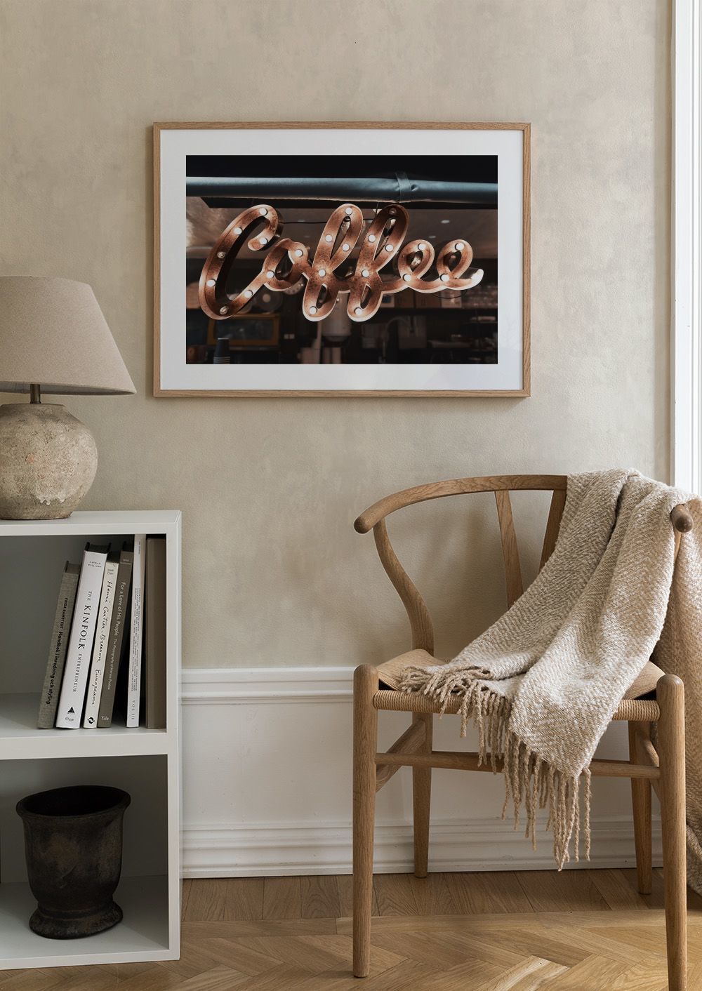 Ruskea "Coffee"-juliste, jossa kirjaimet on koristeltu pienillä valkoisilla valoilla. Täydellinen valinta kahvinystäville!