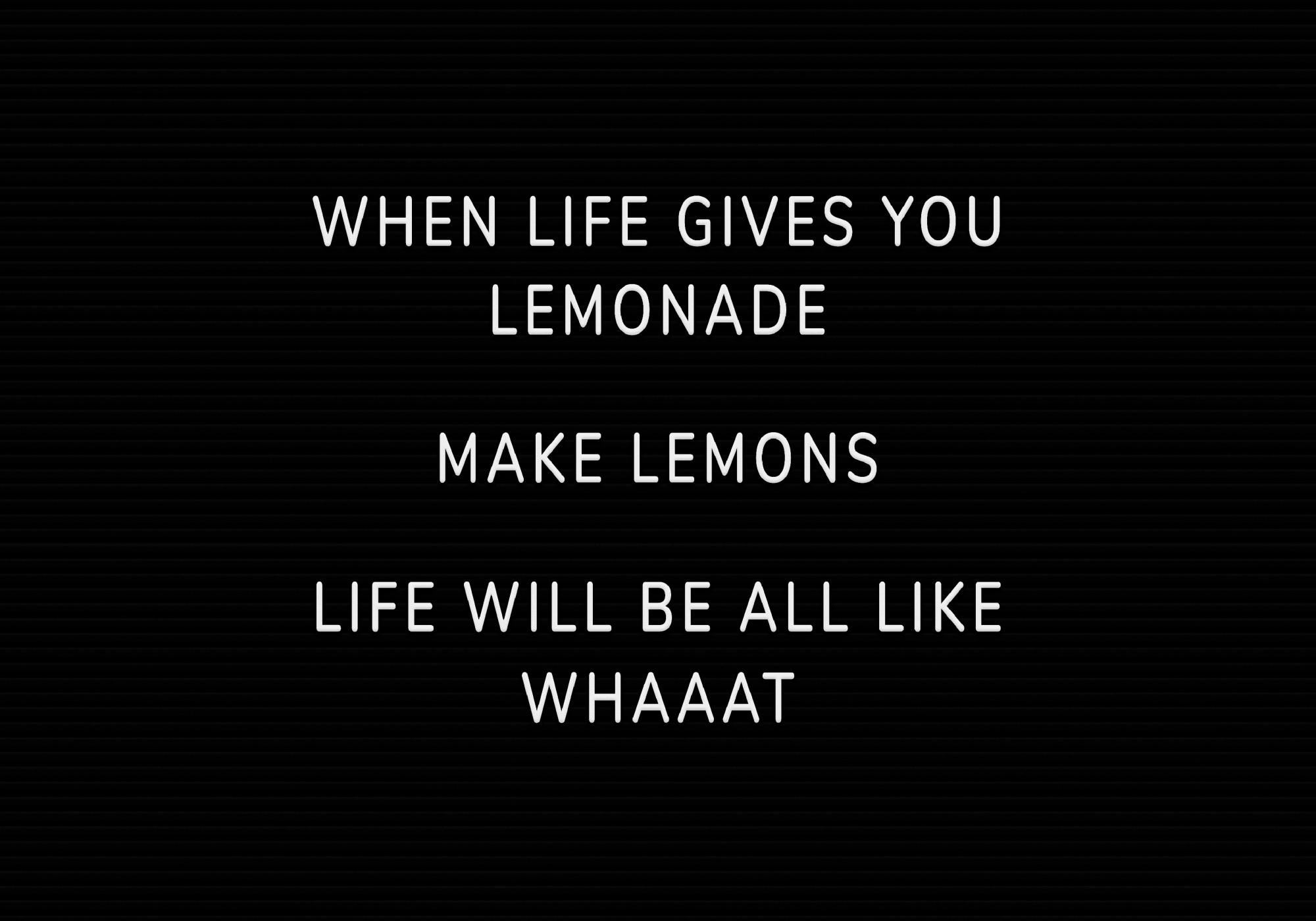 Alkaen 12,87 €Humoristinen juliste, joka keventää mielialaa tekstillä "When life gives you lemonade, make lemons. Life will be all like whaaat ". Tämä juliste valkoisella tekstillä tyylikkäällä mustalla taustalla on helppo yhdistää muiden julisteiden kanssa ja se sopii hyvin myös keittiöön ja olohuoneeseen.