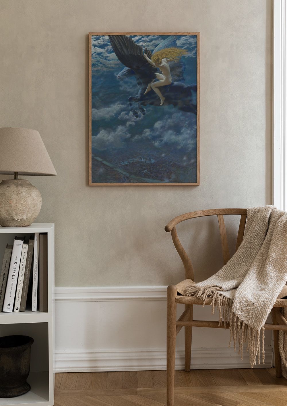 Alkaen 7,77 €Mystinen juliste, jossa ratsastaja lentää siivekäs hevosen selässä pilvien halki. Sininen taivas ja kullanväriset yksityiskohdat luovat unenomaisen tunnelman.