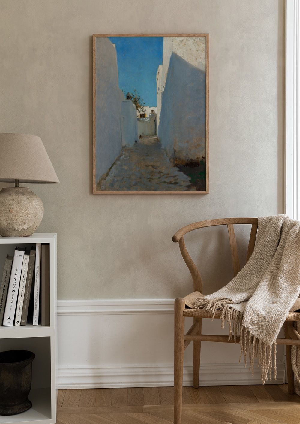 Tämä juliste tuo kotiin rauhallisen kadun tunnelman. Valkoiset seinät ja sininen taivas luovat valoisan ilmeen.