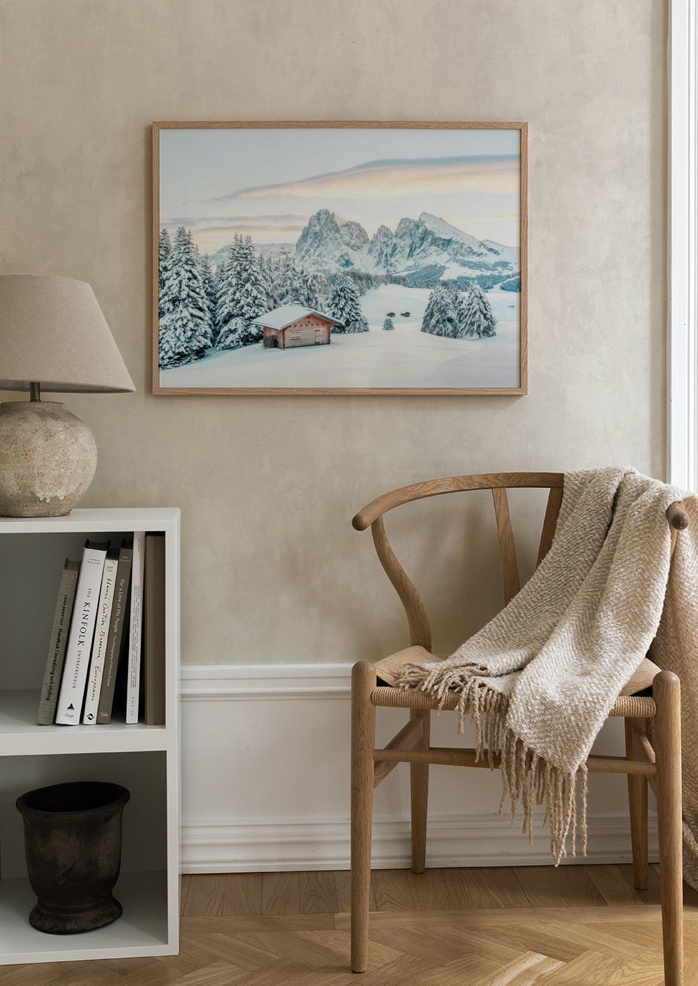 Alkaen 29,95 €Kaunis talvinen juliste lumisesta maisemasta. Pieni puinen mökki seisoo korkeiden kuusien keskellä. Vuoret ja puut ovat lumen peitossa. Taivas on vaalean sininen ja valkoinen.