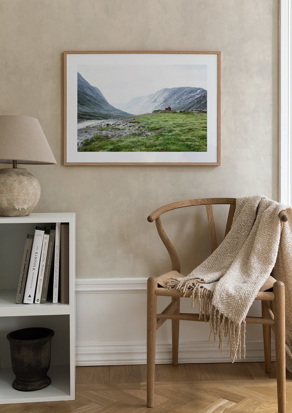 Alkaen 12,87 €Tämä juliste esittää pienen punaisen mökin vihreällä kukkulalla Norjan vuoristossa. Valkoiset kukat koristevat niittyä, kun taustalla kohoavat vaikuttavat vuoret. Rauhallinen ja kaunis maisema tuo luonnon kotiin.