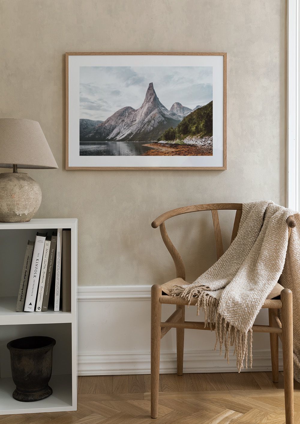 Tämä juliste esittelee komean vuoren, joka heijastuu tyynessä järvessä. Harmaat ja ruskeat kalliot yhdistyvät vihreisiin puihin. Rauhallinen luontomaisema tuo kauniita ulkoilmahetkiä kotiisi.