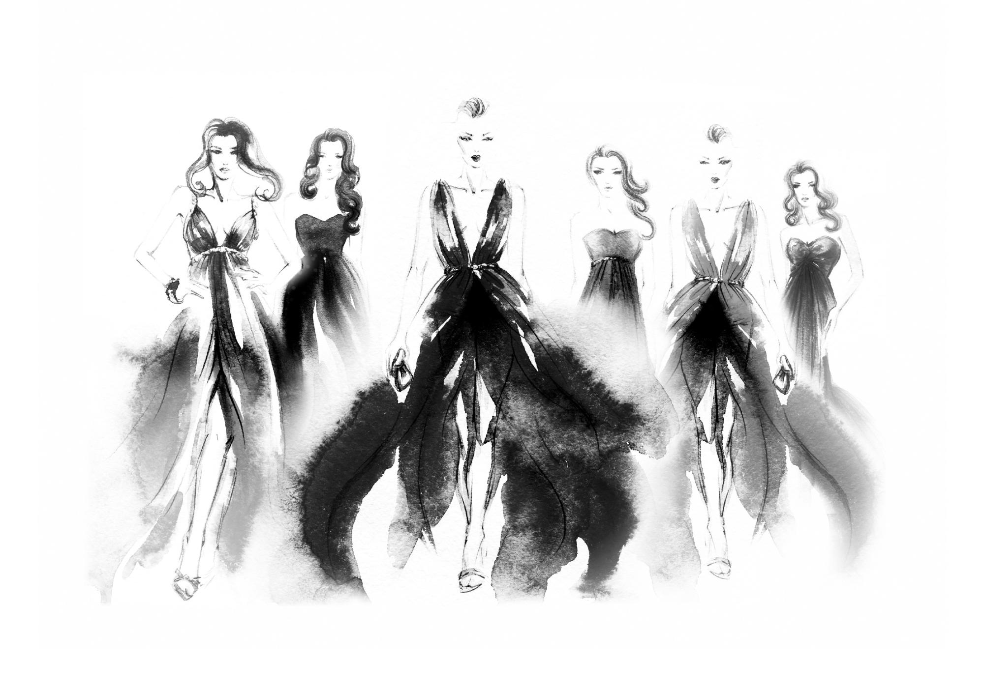 Alkaen 12,87 €Kaunis mustavalkoinen vesivärimaalaus naisista pitkissä, upeissa mekoissa kävellemässä kohti katsojaa catwalkilla. Tyylikäs ja trendikäs juliste, joka sopii täydellisesti yhteen muiden muotiprinttiemme kanssa.