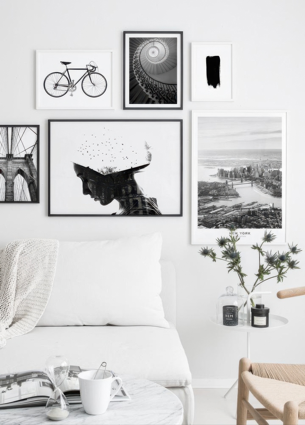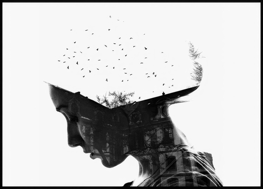 Kaunis kuvataidejuliste, jossa inspiroiva motiivi lentävistä linnuista kattojen yläpuolella naisen muotoisen siluetin sisällä.