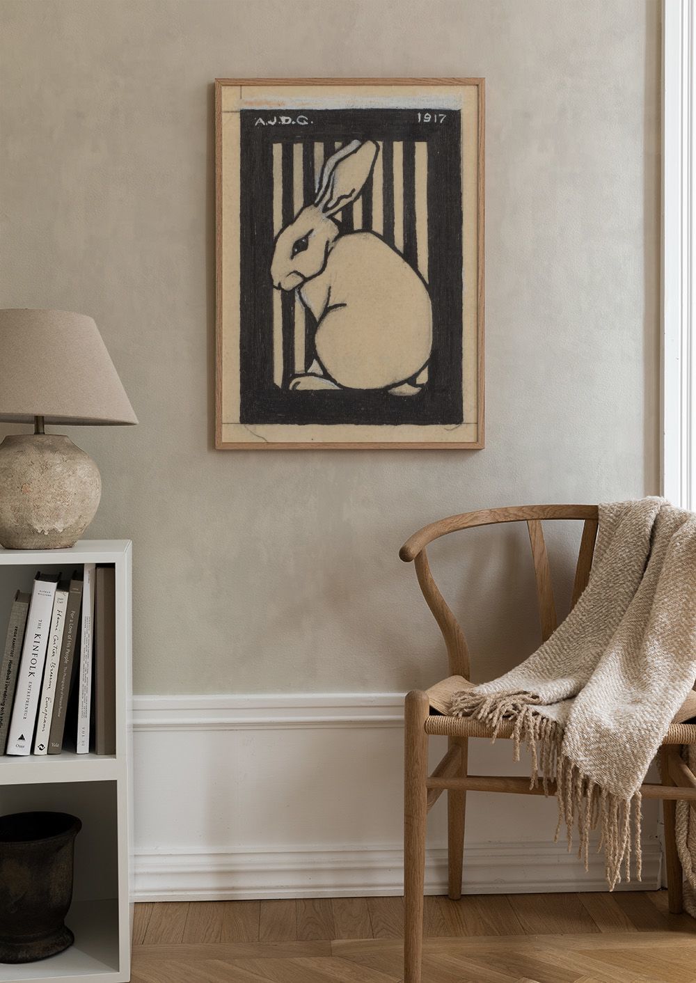 Alkaen 12,87 €Tämä yksinkertainen juliste esittelee istuvan kanin, joka on piirretty kermaisella värillä ja mustilla viivoilla. Taustalla on ruskeat ja mustat raidat, jotka luovat Art Deco -tyylin.