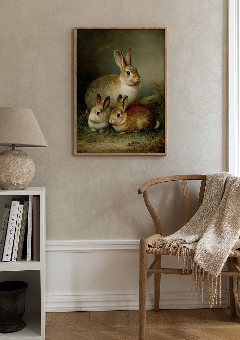 Kolme söpöä kania istuu rauhallisesti ruohikolla. Suurin kani seisoo kahden pienemmän takana. Niiden turkki on ruskeaa, valkoista ja harmaata. Julisteessa on luonnonrauha.