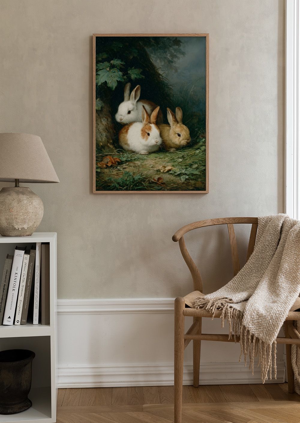 Tämä juliste esittää kolme suloisaa kania vehreällä nurmikolla. Yksi kani on valkoinen, toinen valkoinen ruskeilla täplillä ja kolmas vaaleanruskea. Taustalla näkyy tummia vihreitä lehtiä.