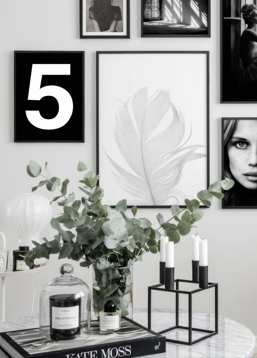 Tyylikäs typografinen juliste valkoisesta numerosta "viisi" mustalla taustalla.
