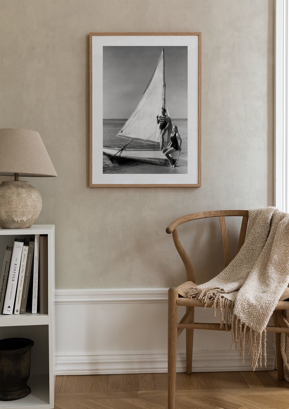 Mustavalkoinen juliste, jossa kaksi ihmistä purjehtii rauhallisella merellä. Suuri kolmionmuotoinen purje ja kirkas taivas luovat kesäisen tunnelman.