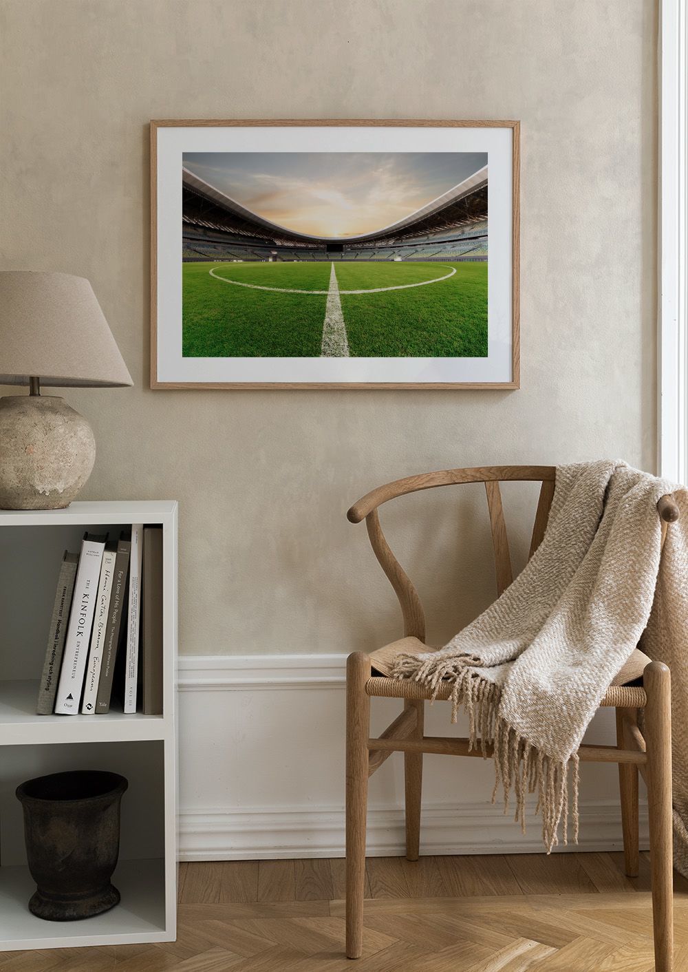Vihreä jalkapallokenttä tyhjän stadionin keskellä. Valkoinen ympyrä ja viivat näkyvät selvästi nurmikolla. Taivas on oranssi ja sininen.
