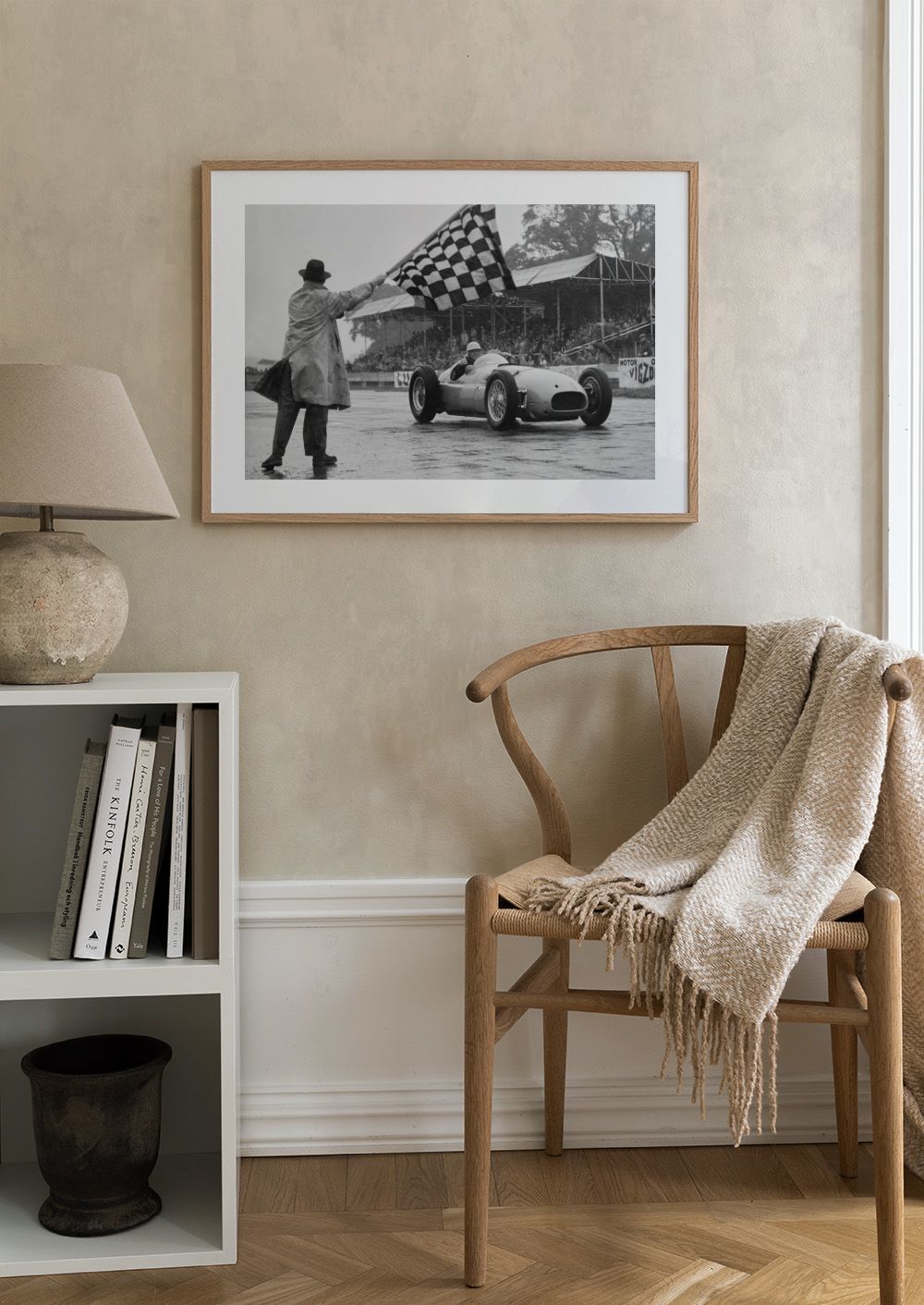 Mustavalkoinen juliste, jossa vintage-kilpa-auto ajaa märällä radalla. Kuljettaja kypärässä ja mies heiluttaa ruutulippua. Klassinen tunnelma.
