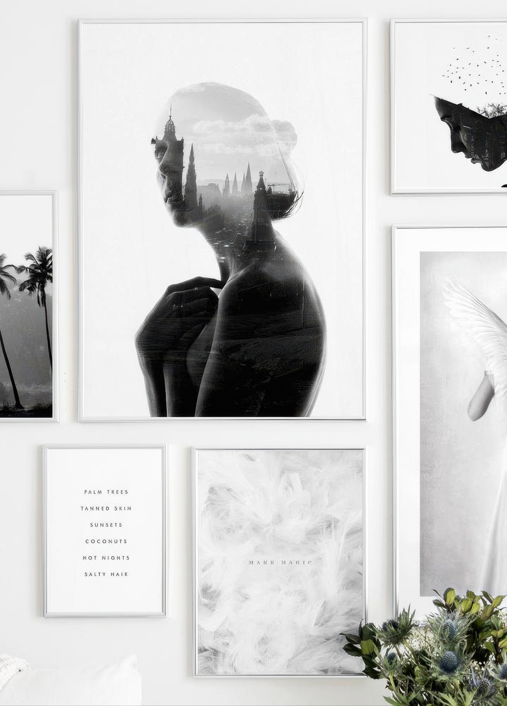 Tyylikäs mustavalkoinen juliste kaupungin tapahtumista naisen muotoisen siluetin sisällä.